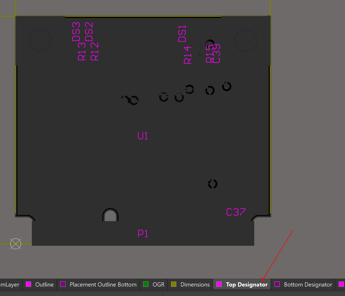 6)、顯示Top Designator層,元件位號(hào)已經(jīng)顯示。并且當(dāng)元件在Top層或Bottom層之間變換時(shí),位號(hào)會(huì)和絲印層一樣自動(dòng)調(diào)整到對(duì)應(yīng)的顯示層。