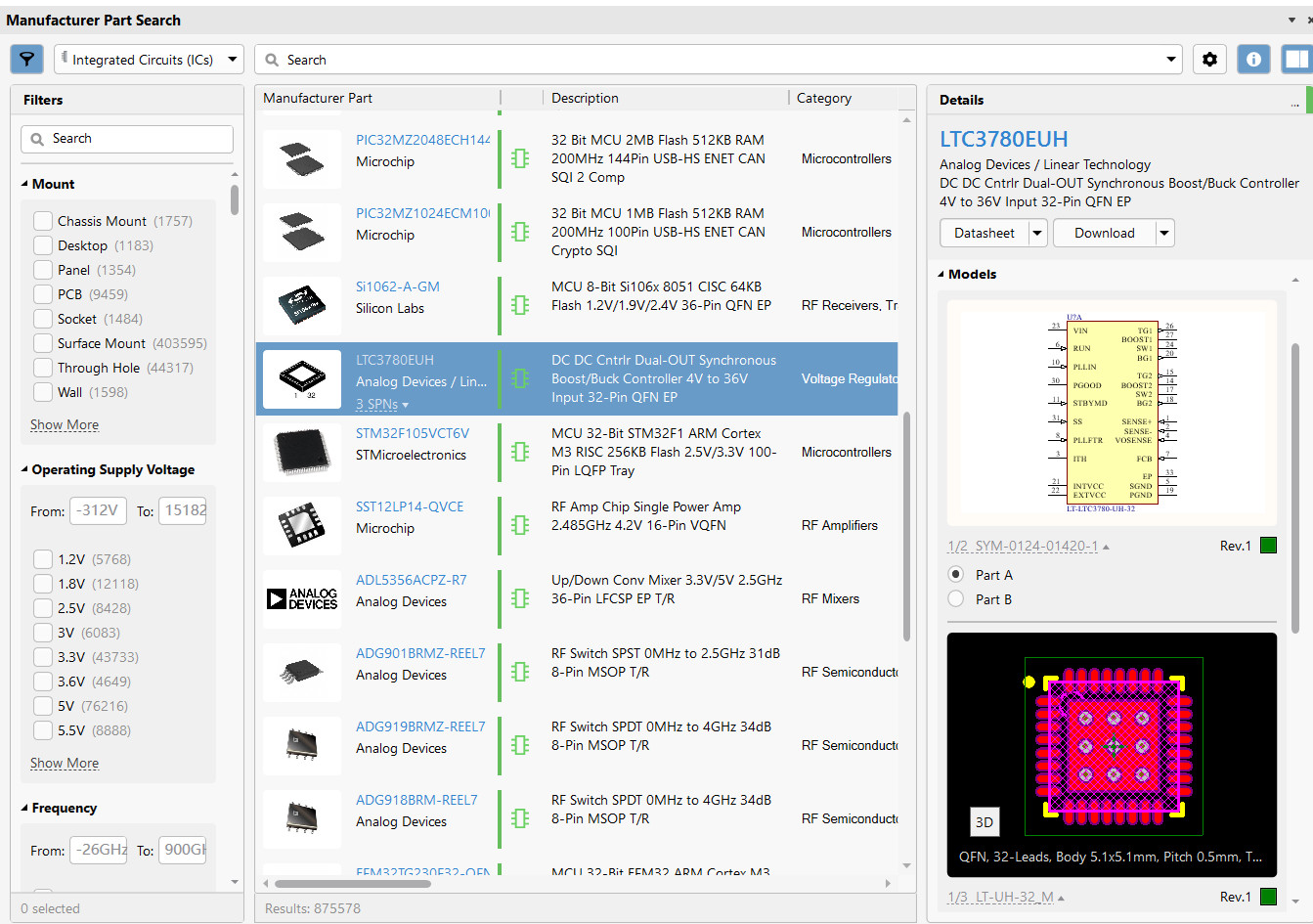 Altium提供“供應鏈搜索“功能,在軟件內直接輸入搜索關鍵字,系統會在全球主流的幾個器件代理商數據庫中進行搜索,直觀地看到元器件重要參數、原廠數據手冊、價格、庫存、生命周期狀態等信息。他們可以:
