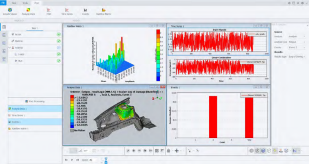 疲勞結果的后處理可以在FATIQ的 交互式過程中執行。專用圖,如 PS D 圖 、 事 件 圖 、 雨 流 矩 陣 和 3D條紋,相互補充,提供分析結 果的清晰視圖。