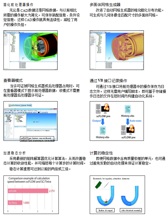 我們開發的新一代計算流體力學軟件 scFLOW 已成為集各種新技術、簡單實用功能于一身的先進工具。目前,該軟件配備了新的解算器,不僅運行穩定,而且計算速度比以前提高三倍(最多),同時通過新的前處理器可讓初級用戶處理復雜模型及劈分高質量的網格。該軟件一直在推陳出新。