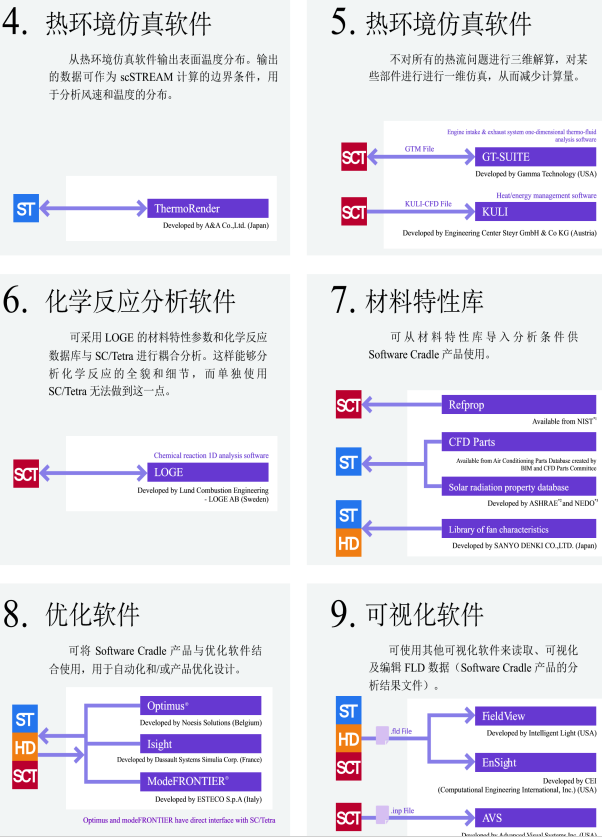 Software Cradle 提供了兩種不同類型的熱流分析工具: 采用結構化網格的 scSTREAM 和 HeatDesigner,以及采用非結構化網格的 SC/Tetra 和 scFLOW。