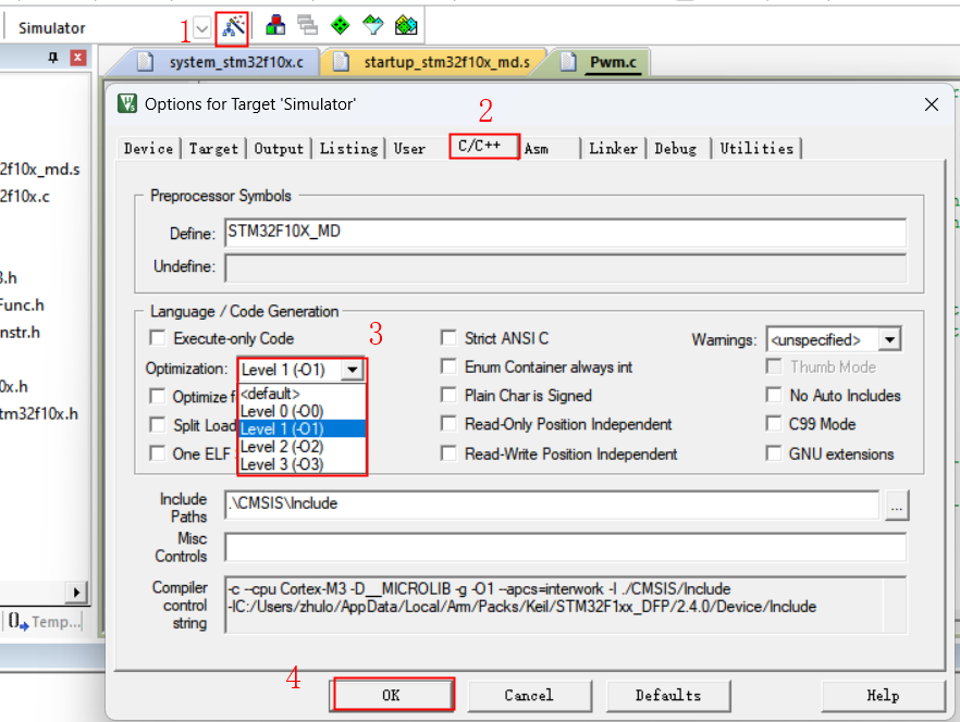 首先點擊圖4-1-1標記1處快捷方式,進入 Options for Target 目標窗口- ,并選擇C/C++(AC6)。uVision中,可以根據如圖4-1-1的標記 3 選擇優化的級別。