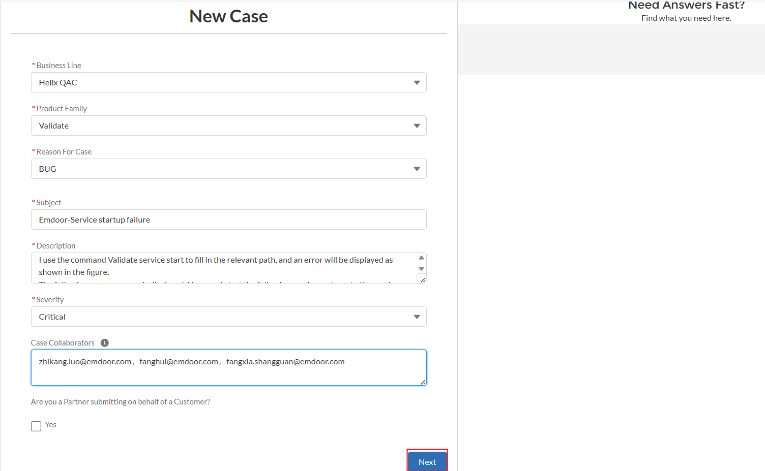7.填寫(xiě)問(wèn)題的產(chǎn)品線、產(chǎn)品類別、原因、主題、描述信息、嚴(yán)重性、需要抄送的郵箱和我們是否為客戶提交。填寫(xiě)完畢后點(diǎn)擊”Next“
