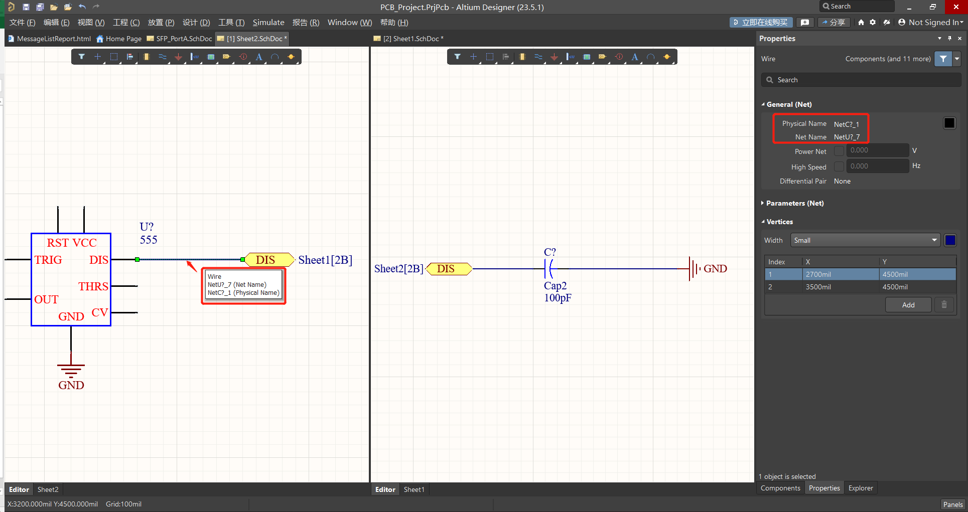 在下圖中鼠標懸浮在Wire上顯示連接兩端的連接信息:【NetU?-7】555芯片的7號管腳;【NetC?-1】電容Cap的1號管腳,打開Wire的屬性板也可以看到懸浮窗口的信息。