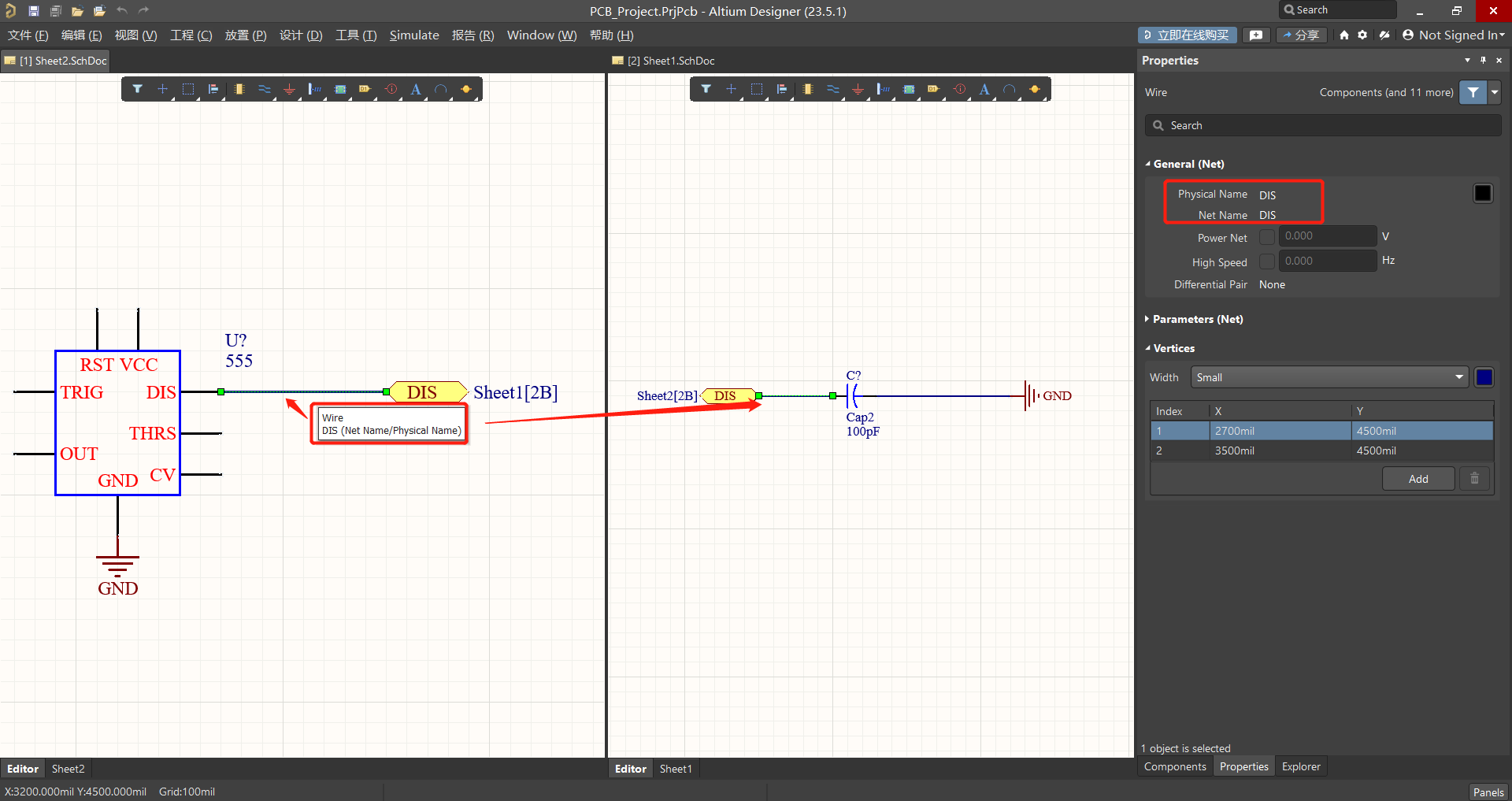 這時回到原理圖工程中,鼠標懸浮在Wire上顯示網(wǎng)絡信息:【DIS】與端口的命名相一致。打開屬性面板也可以看到Wire網(wǎng)絡信息的變更。