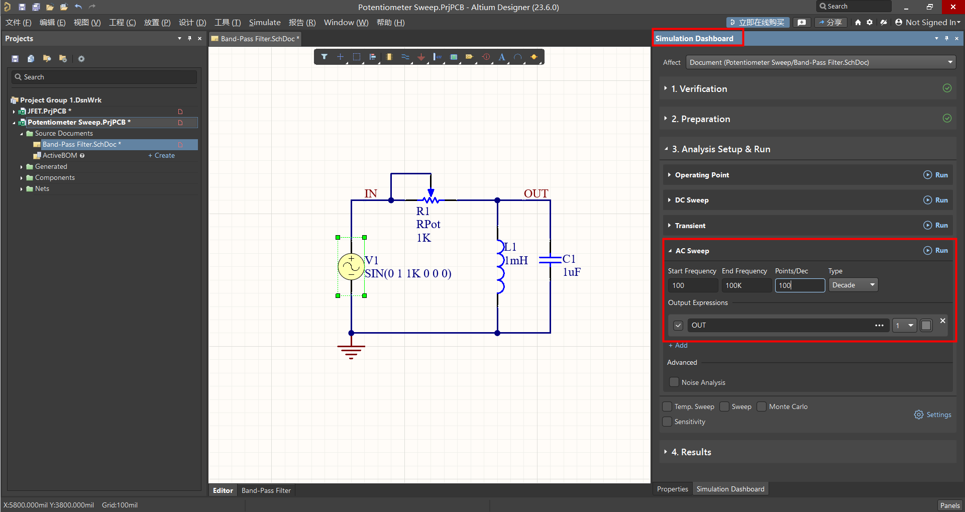打開【Simulation Dashboard】仿真儀表盤,設(shè)置交流掃描參數(shù):頻率范圍,Start Frequency(起始頻率)設(shè)為 100,End Frequency(停止頻率)設(shè)為 100k,Points/Dec(測試點(diǎn))設(shè)為 100。Type 為Decade。點(diǎn)擊【Run】