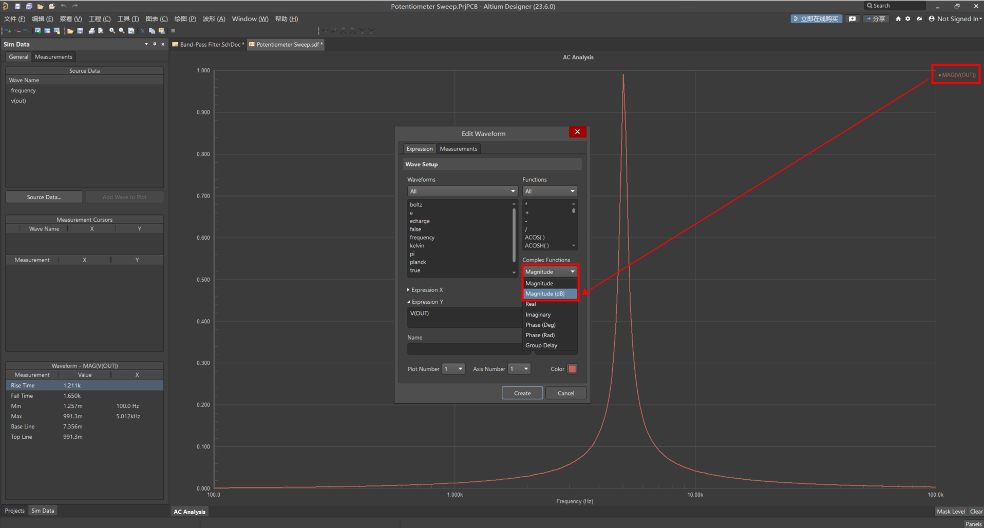 對于顯示的輸出波形,要查看以 dB 為單位顯示的輸出信號,直接雙擊波形名稱。在"編輯波形"的"復(fù)合函數(shù)"部分,將"幅度"選擇改為"幅度(dB)"。點(diǎn)擊【Create】。