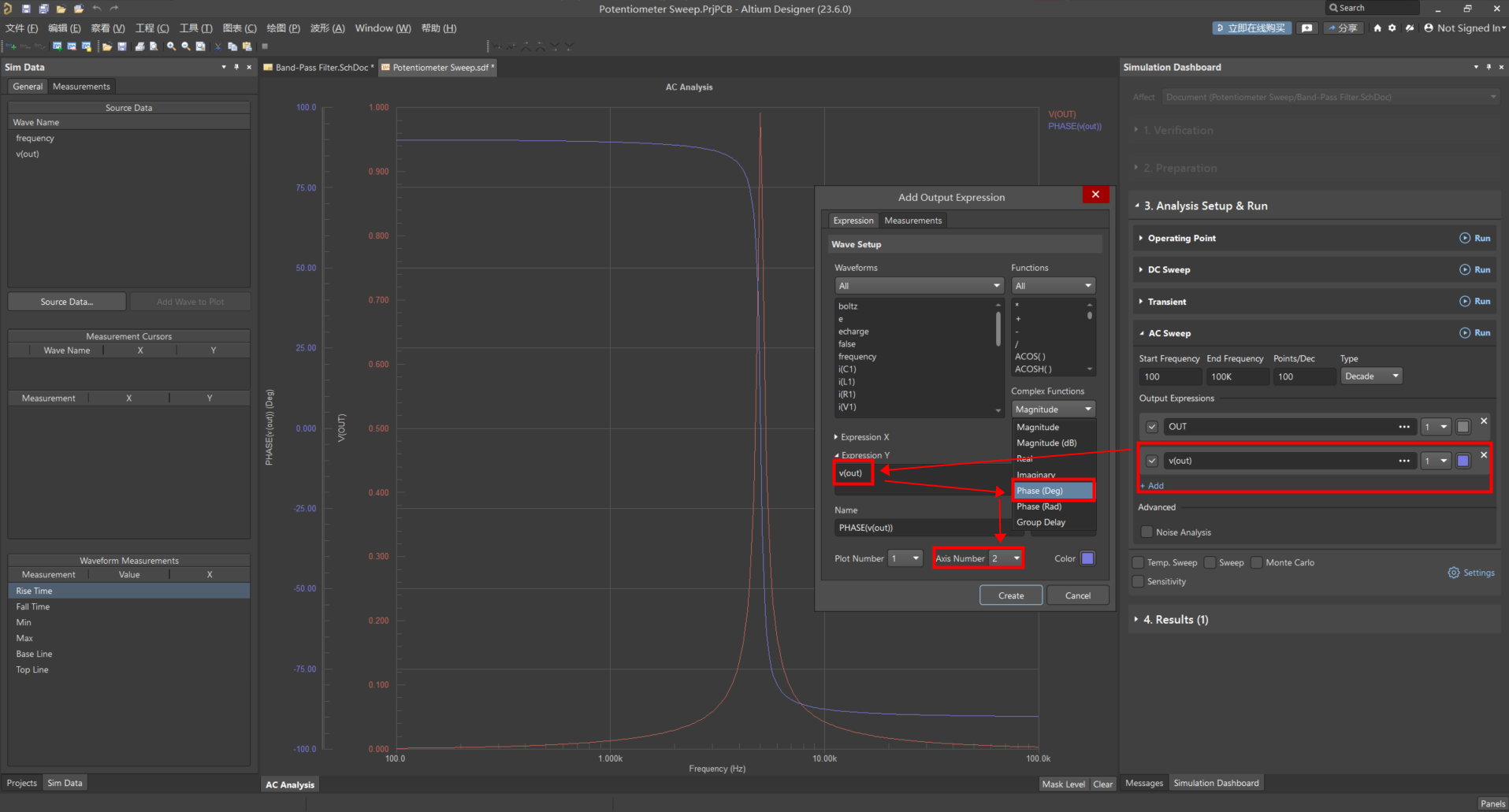 在【Simulation Dashboard】仿真儀表盤,添加輸出波形 V(out),將【Complex Functions】復(fù)合函數(shù)設(shè)置為【Phase (Deg)】相位(度),并選擇“添加到新的Y軸”,從而添加相位。點(diǎn)擊【Create】。(相頻特性曲線)