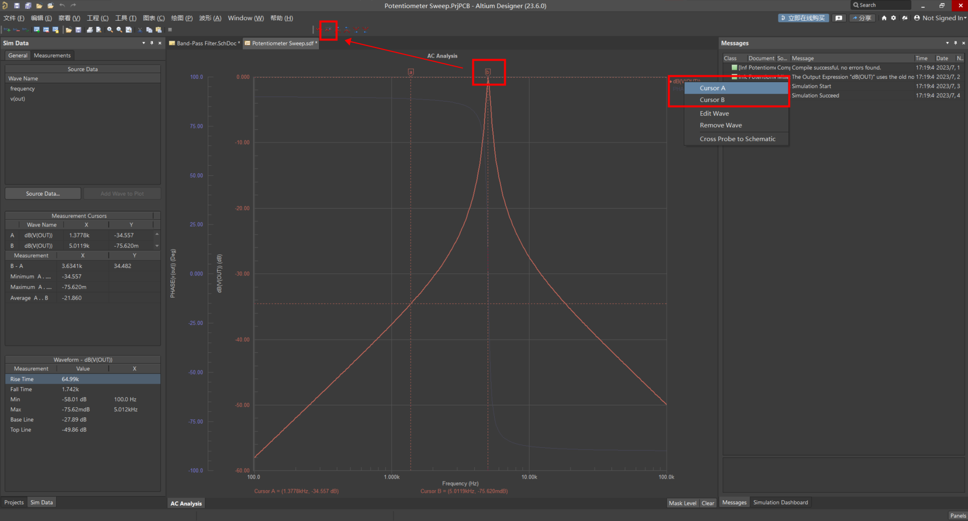 為 dB(out) 波形啟用兩個(gè)光標(biāo)。右擊波形名稱并選擇【Cursor A】,然后再次選擇【Cursor B】。點(diǎn)擊光標(biāo) B,然后點(diǎn)擊工具欄找到最大點(diǎn)。