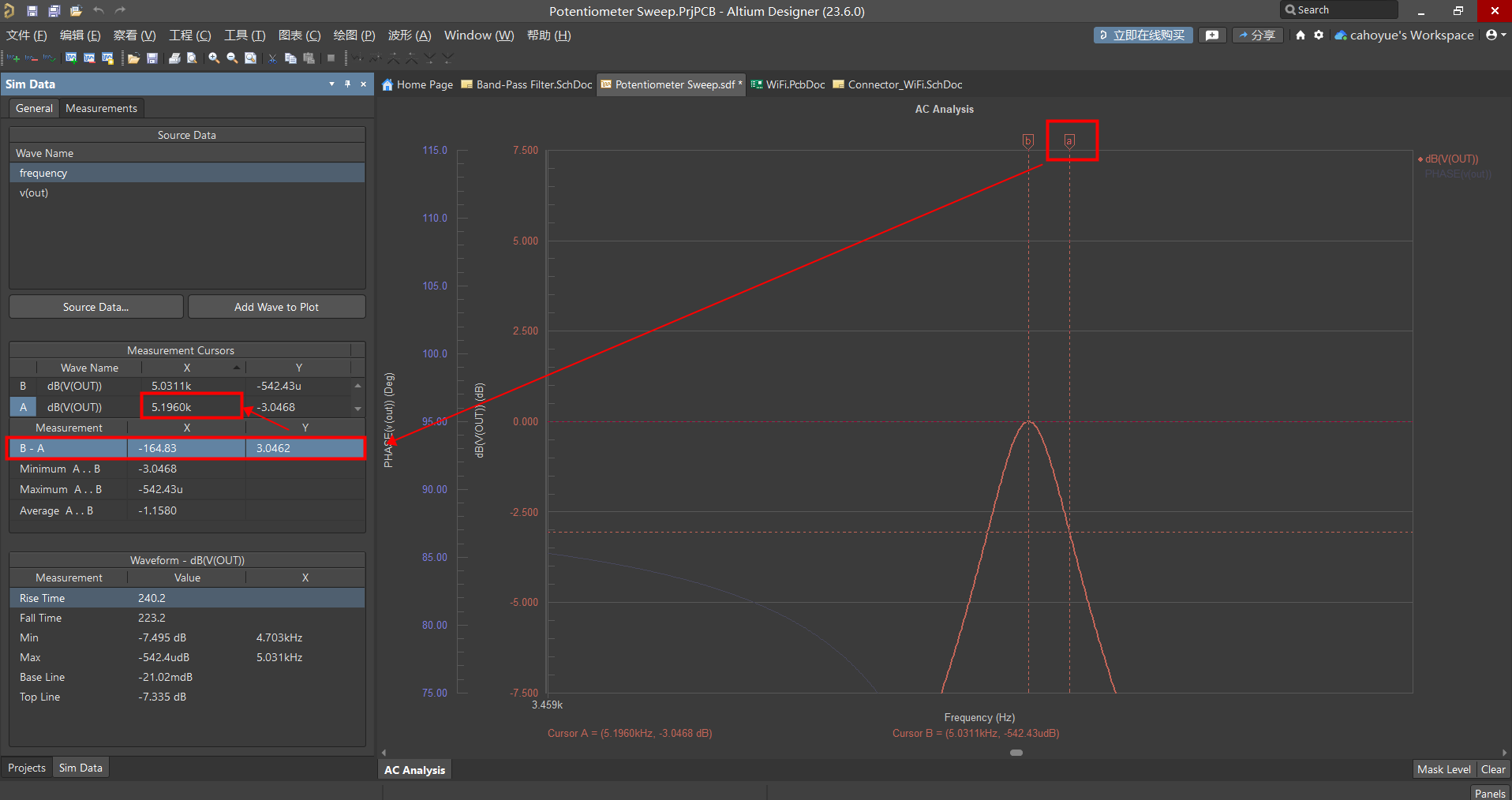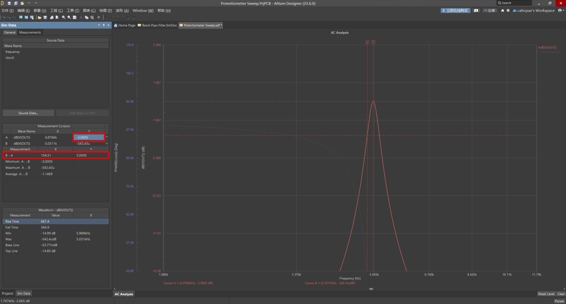 在【Sim Data】模擬數(shù)據(jù)面板的測量面板部分,為光標(biāo) A 的 Y 值輸入一個(gè)值,使得( B 的 Y 值)-( A 的 Y 值)為 (-542.43u-(-3))。分辨率只有小數(shù)點(diǎn)后 4 位,因此輸入 -3.0005。結(jié)果顯示 X 的值(代表該點(diǎn)的頻率值 4.8766KHz)。
