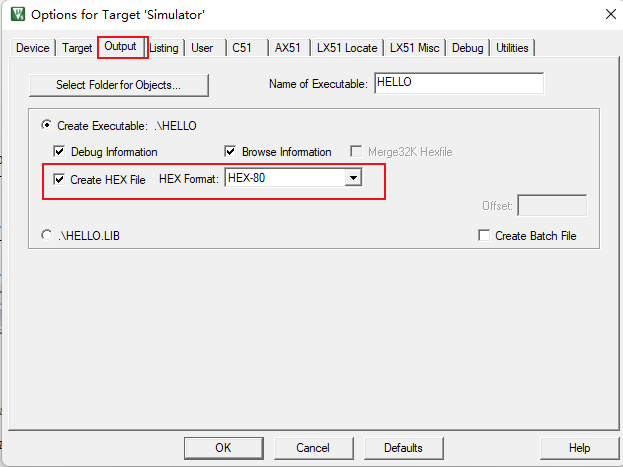 在PK51中可以在options->output中使用“Create HEX File”選項生成HEX文件進行使用(如圖2-1)。但是,有些情況下,需要使用bin文件而不是hex文件。