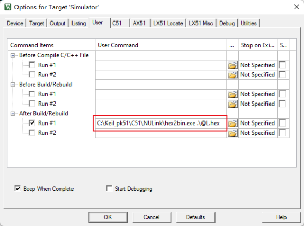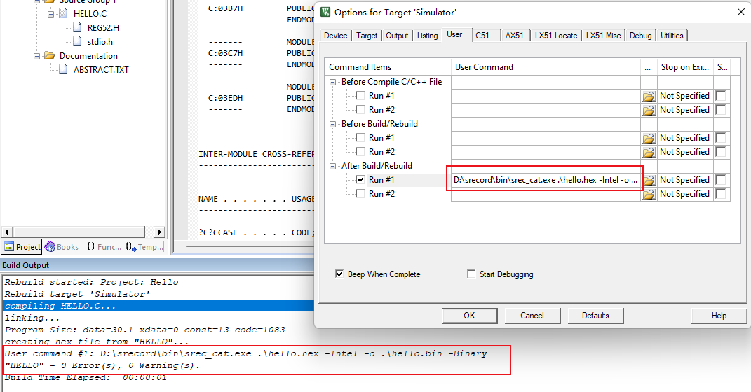 (2)、安裝完成后,也是在PK51中進入到options->User欄中,在After Build/Rebuild的輸入欄中,輸入命令"D:srecordbinsrec_cat.exe #H -Intel -o $H@P.bin -Binary"(如圖2-2-1) 。命令解析是指定srec_cat.exe路徑,#H表示期望輸入的是hex文件,-Intel表示指定應將輸入文件解釋為Intel HEX文件,-o表示輸出參數,$H@P.bin表示輸出為bin文件。-Binary表示指定應將輸出文件生成為二進制文件。