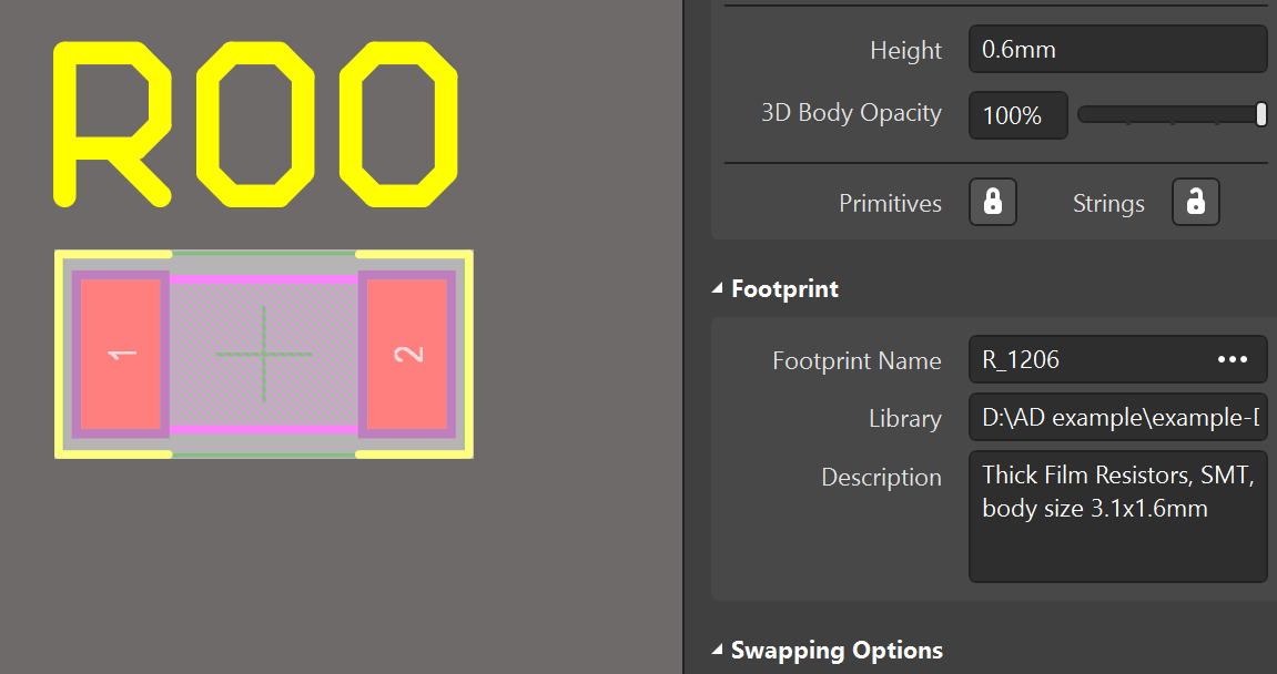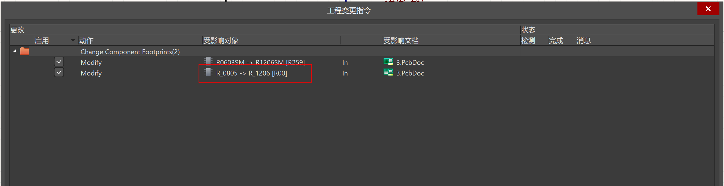 設計中對某一個元器件的封裝進行更換(原理圖符號關聯的封裝由封裝A更改為封裝B)之后執行update PCB,原封裝無法被新封裝替換。見圖1,R00的封裝由0805更改為1206,原理圖中查看該元件,封裝已被替換,但是update PCB后,R00的封裝依然是0805,見圖2。