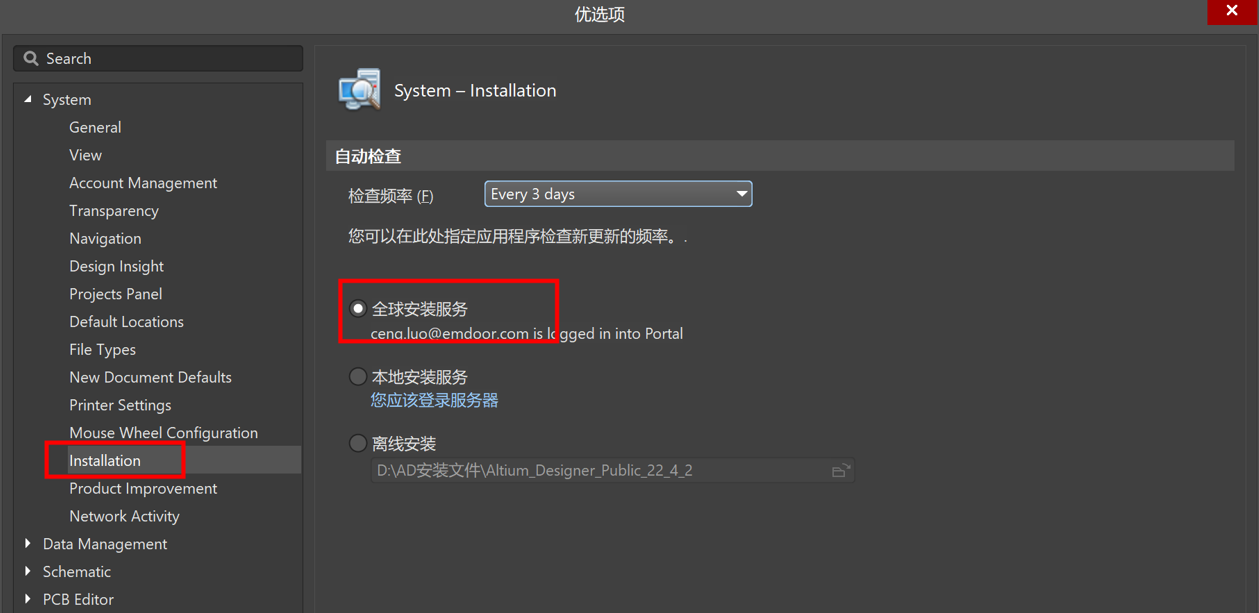 AD軟件內(nèi)在線升級,首先需要確認(rèn)優(yōu)選項(xiàng)設(shè)置中幾個(gè)地方設(shè)置是否準(zhǔn)確。