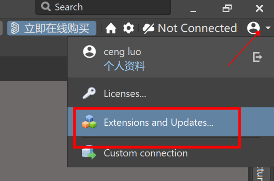 點(diǎn)擊右上角用戶信息的頭像,選擇“Extensions and Updates”