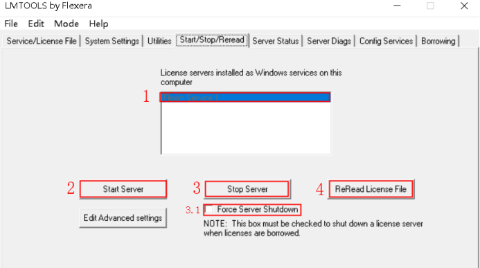 點擊標記4處:更新許可證服務器而不停止和啟動它。當您手動通知許可證服務器有關許可證的更改時,需要使用此按鈕。