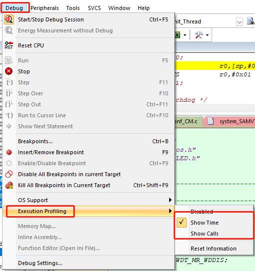 2)、進入到Debug模式下后。找到Debug->Execution Profiling。根據需求選擇Show Time(顯示執行指令的累積時間)還是Show Calls(顯示一條指令執行的頻率)。(如圖4-2)