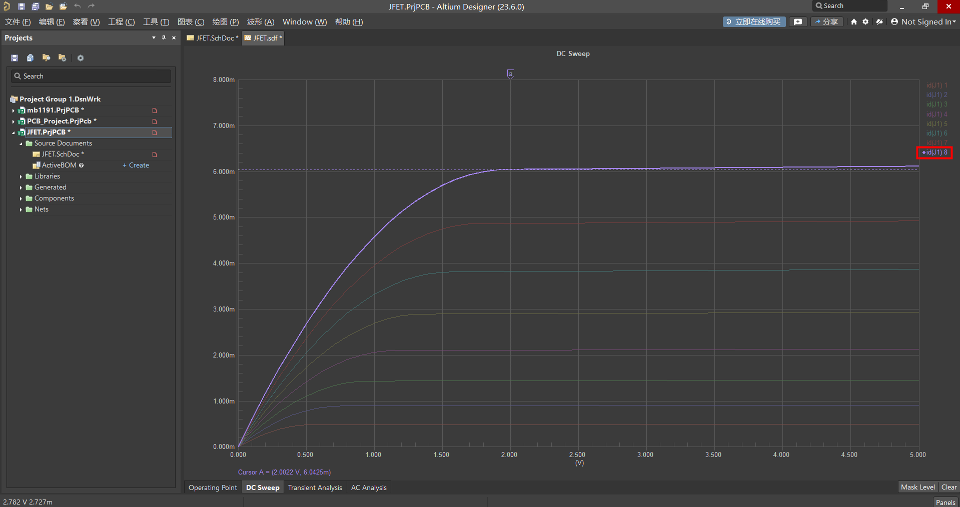 2、舊版仿真出的曲線,針對 VGS 不同的條件,每條曲線顏色顯示相同,使用探測時,顯示的數值為最底下的曲線數據。