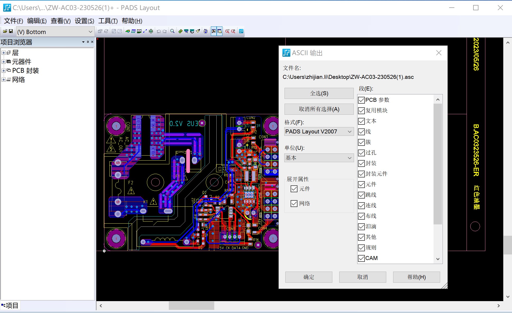 1、首先我們需要到PADS軟件中執行菜單命令“文件→導出”類型是.asc文件,選擇好位置之后點擊保存,在彈出的ASCII輸出界面框點擊全選輸出所有段,在格式中選擇“PADS Layout V2007”,展開屬性里勾上元件和網絡,如圖所示,然后點擊確定導出PADS文件,如圖1所示。