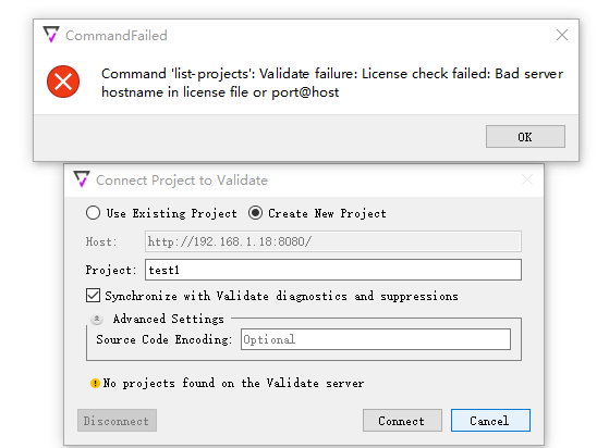 在QAC的圖形化界面中連接Validate創(chuàng)建View工程,出現(xiàn)報錯 ?“Command 'ist-projects’: Validate failure: license check failed: Bad serverhostname in license file or?port@host”