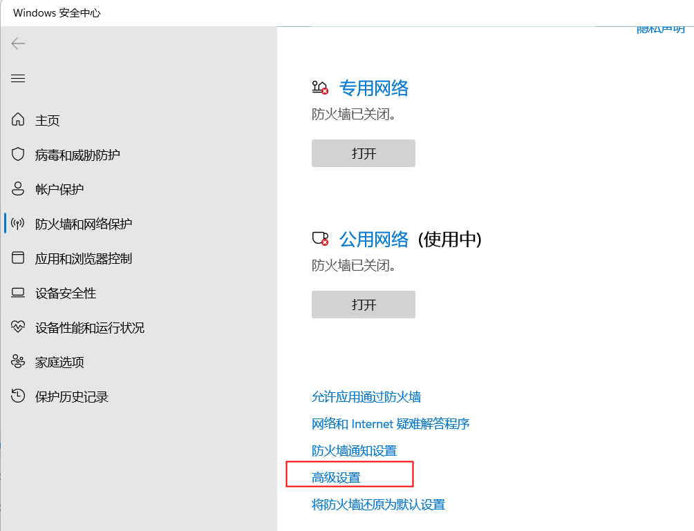 1)、在客戶端機器上打開“防火墻和網(wǎng)絡保護設置”、點擊“高級設置”。
