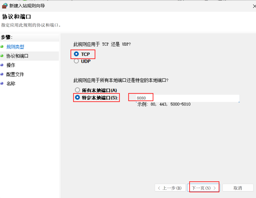 4)、選擇“TCP” 、再選擇“特定本地端口(S)”、輸入Validate特定端口“8080”,再點擊“下一頁(N)”