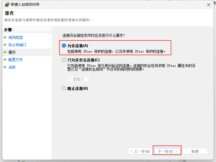 5)、選擇“允許連接(A)”再點擊"下一頁(N)"。