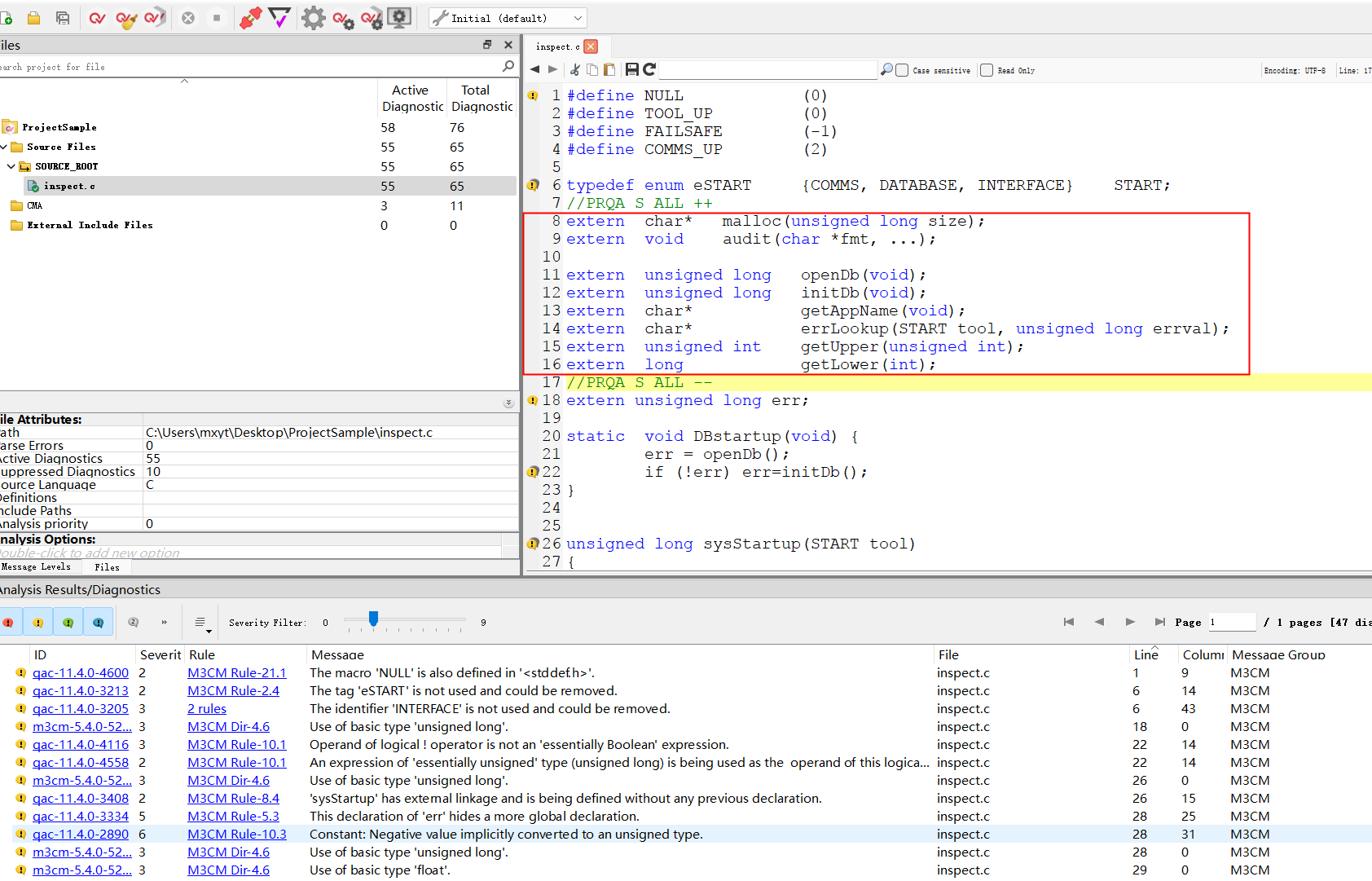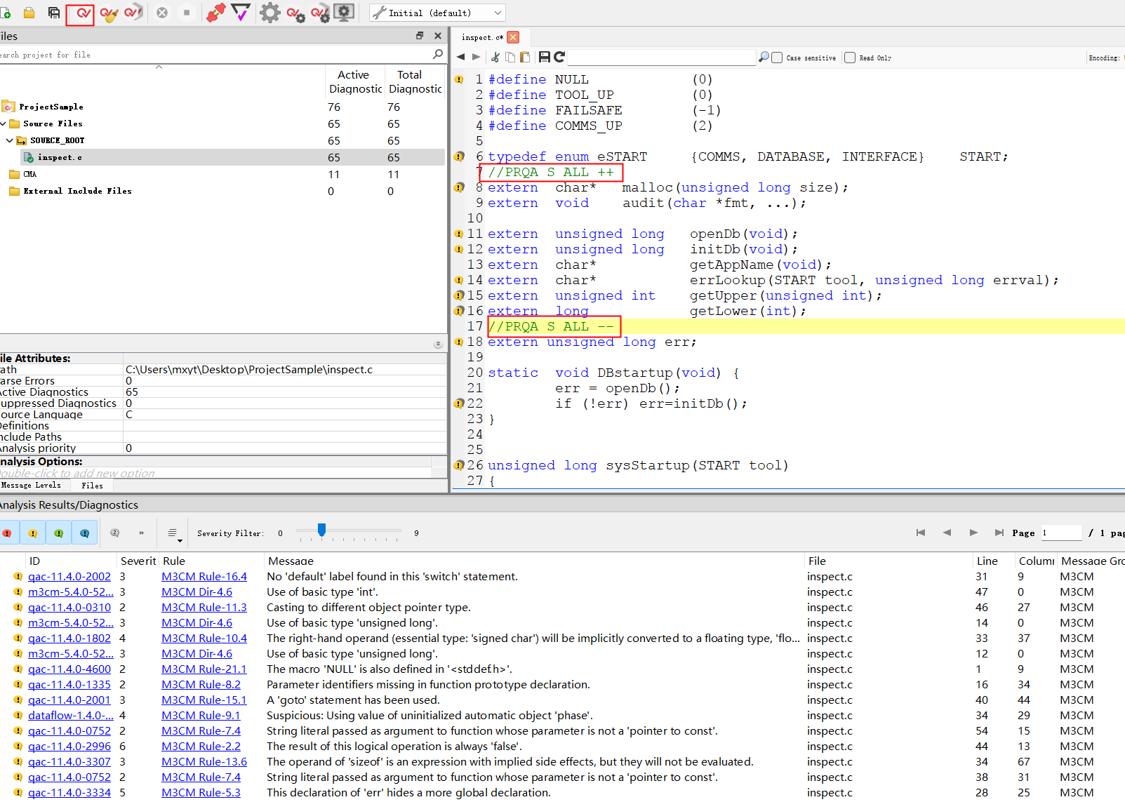 2、在不想?yún)⒓訏呙璧脑创a開始和結(jié)尾處添加注釋“ //PRQA S ALL ++”和“ //PRQA S ALL --”,保存,點(diǎn)擊分析按鈕重新掃描項(xiàng)目;