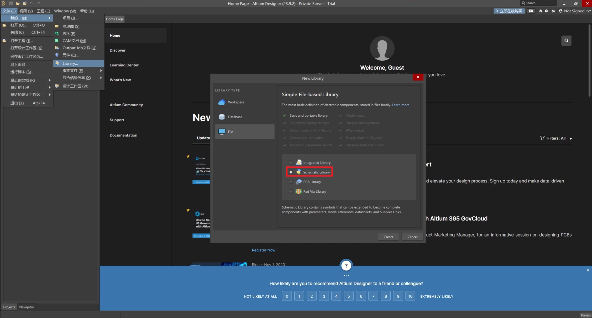 1. 在 AD 主界面主菜單下,選擇 File → New → Library → Schematic Library → Create。