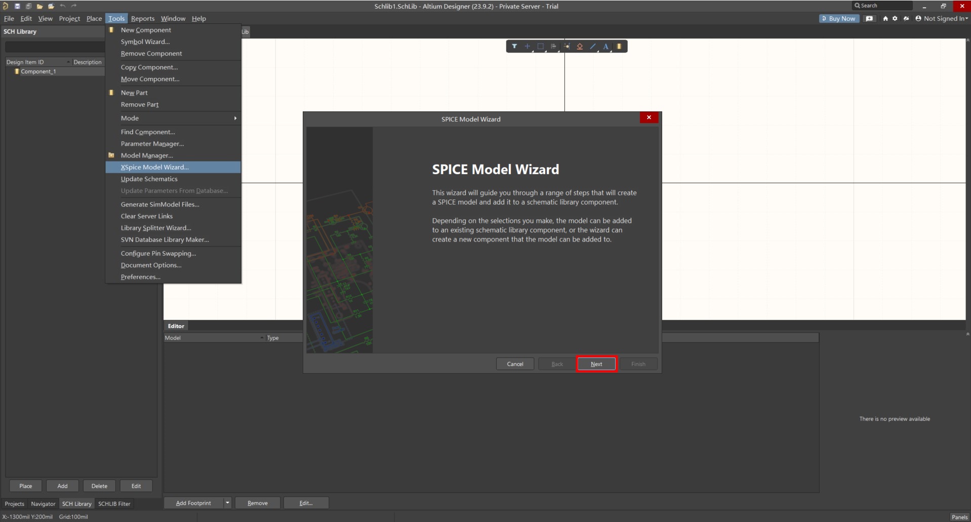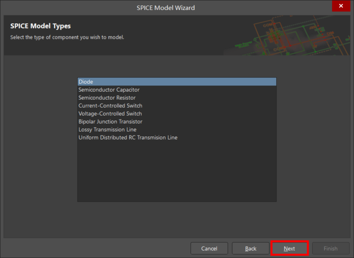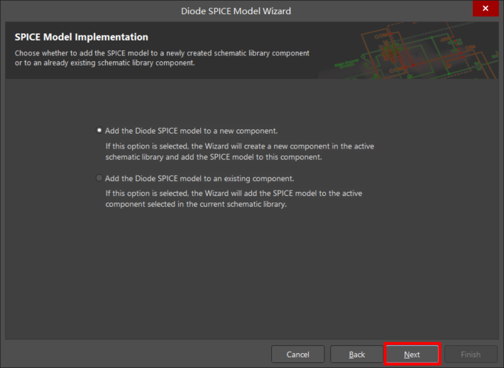 如果選擇此選項,向導將在活動原理圖圖庫中創建新元件,并將SPICE模型添加到此元件。