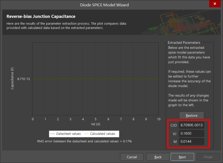 提取的參數(CJO、M、VJ)這些參數用于描述在反向偏置區域中操作時二極管的電容。