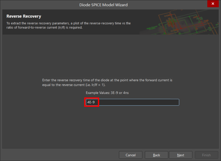 Enter the reverse recovery time of the diode at the point where the forward current is equal to the reverse current(輸入在正偏電流和反偏電流相等點,即 Ir=If 的反向恢復時間):4E-9。