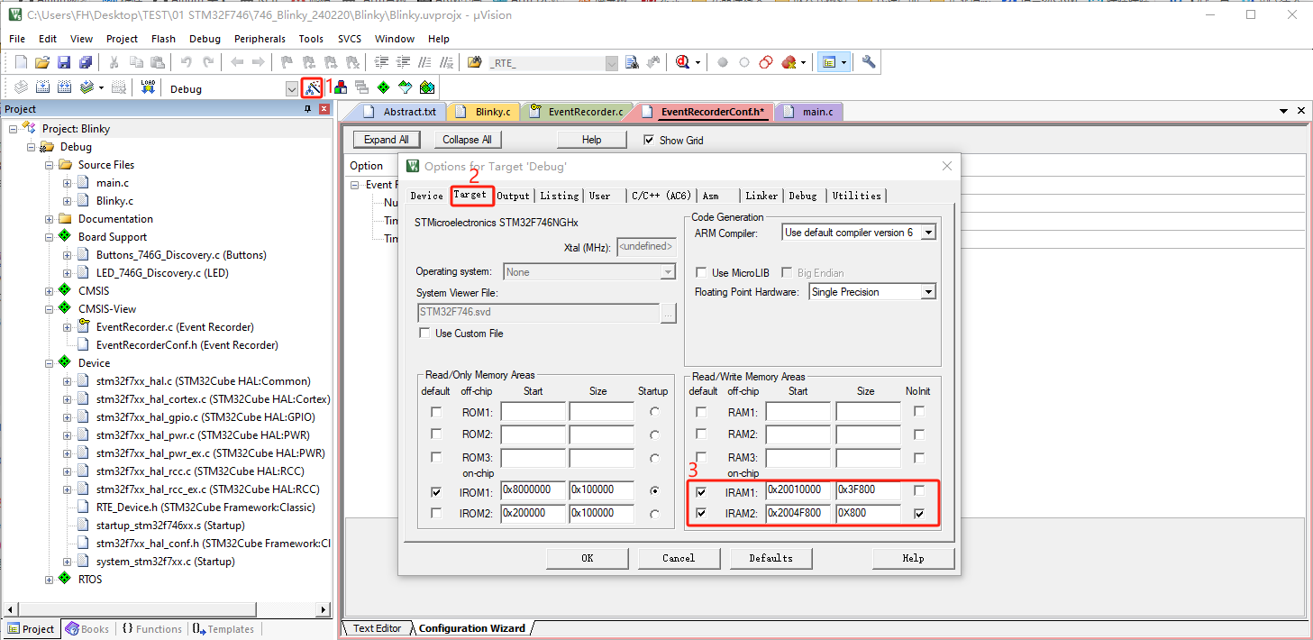 1. 選用STM32F746 中自帶的 Blink 示例進行測試。