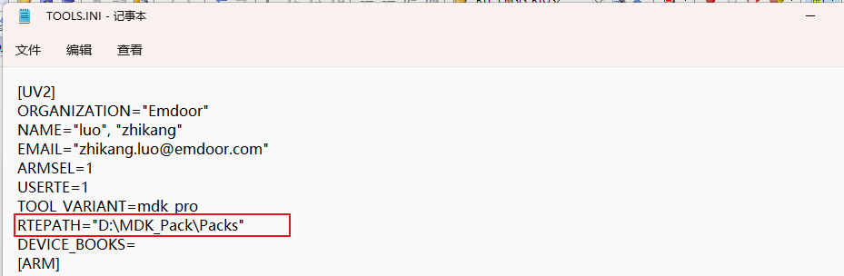 (2)、進入到MDK的安裝目錄下,目錄下有一個TOOLS.INI文件。打開這個文件后,RTEPATH這個關鍵字就是keil MDK中用于指定Pack包搜索路徑的關鍵字。將之前的“RTEPATH="C:UsersUSERAppDataLocalArmPacks"”修改成“RTEPATH="D:MDK_PackPacks"”。(如圖4-2-2)