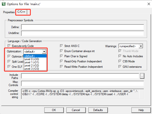 2)、然后,在打開的Options for File ‘main.c’窗口中,切換到C/C++欄,在Optimization中去選擇優化等級(如圖4-2)?!?lt;default>”選項是默認使用整個工程采用的優化等級。選擇“Level 0/1/2/3”就是將對應的源文件使用O1/2/3優化等級去進行構建。