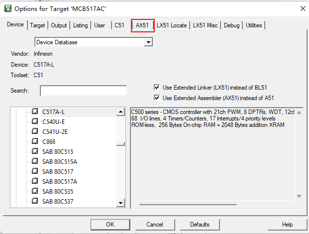 1)、在Options->Device窗口中,可以找到“Use Extended Linker (LX51) instead of BL51”的勾選項。選擇后,鏈接器的使用選項就會變成LX51(如圖4-1)。