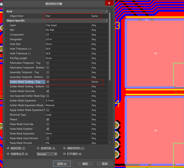2)、當有復數焊盤需要修改時,可以使用“查找相似對象”來找出被蓋油的焊盤,并集中修改。先選中一個蓋油的焊盤,然后右鍵選擇“查找相似對象”,”Object Kind處為Pad,選擇Same,“Solder Mask Tenting – Top”(以top面焊盤舉例)處打勾,選擇Same,這樣就能批量選中被蓋油的焊盤,然后在屬性中去除Tented打勾即可。