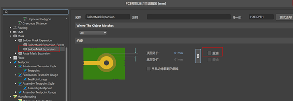3)、查看一下規則設置中,Soldermask蓋油規則中有沒有誤打勾,如果有,則PCB上所有焊盤會被蓋油,取消打勾即可。