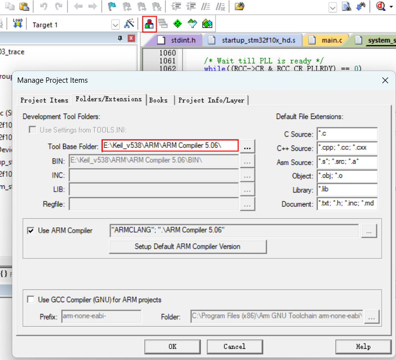 3)、進入“Manage Project Items”界面后選擇“Folders/Extensions”, 在Tool Base Folder內選相關的文件路徑,將路徑修改為“E:Keil_v538ARM”后點擊“OK”,再進行燒錄可以成功燒錄。