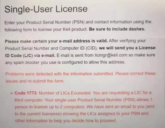 在安裝LIC時,在Keil單用戶許可證頁面上單擊Submit后出現錯誤:Code 1773 Number of LICs for this PSN Exceeded.
