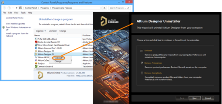 • 在列表框中選擇您希望從中刪除首選項的 Altium Designer 版本 - 選擇“卸載”以啟動 Altium 卸載程序對話框,從卸載程序對話框中選擇“刪除首選項”< ok >,<完成>。